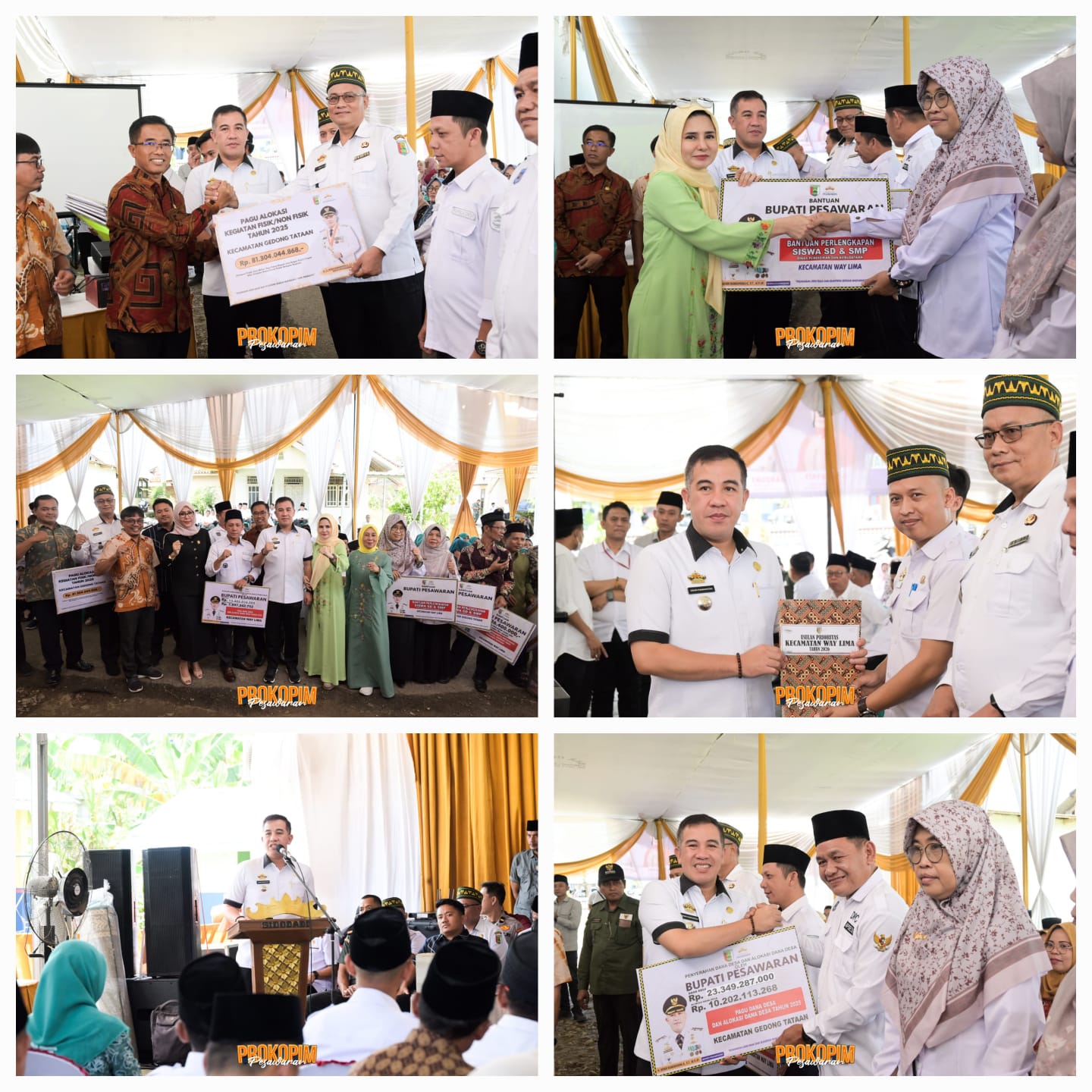 Pada kesempatan tersebut, Bupati bersama jajaran juga turut menyerahkan berbagai jenis bantuan, mulai dari bantuan untuk tokoh agama seperti pembantu penghulu, guru ngaji, marbot, dan penjaga makam, hingga bantuan untuk masyarakat umum seperti hibah masjid, santunan anak yatim, dan sembako untuk kaum duafa. Bantuan lainnya mencakup perlengkapan siswa SD dan SMP, serta pagu alokasi kegiatan fisik dan non-fisik di Kecamatan Way Lima dan Gedong Tataan.