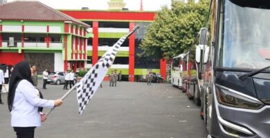 Walikota Bandar Lampung Hj. Eva Dwiana Melepas Peserta Wisata Rohani Umat Beragama Kota Bandar Lampung Gelombang Ke-2 Tahun 2025 Di Halaman Parkir Kantor Pemkot Bandar Lampung
