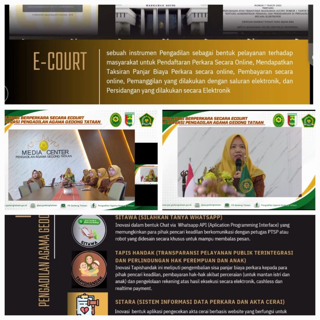 Pesawaran, 14 Maret 2025 – Dalam rangka memberikan pemahaman layanan berperkara hukum kepada masyarakat dan para pemangku kepentingan, Pengadilan Agama (PA) Gedong Tataan menggelar Sosialisasi E-Court dan Inovasi layanan berperkara. Kegiatan ini dilaksanakan secara daring melalui zoom meeting pada Jum’at, (14/3/2025) dengan diikuti oleh berbagai instansi seperti Kejaksaan Negeri Pesawaran, Pengadilan Negeri Gedong Tataan, Kantor Wilayah Kementerian Agama Kabupaten Pesawaran, Kantor Urusan Agama di setiap Kecamatan, serta para pemangku kepentingan lainnya.