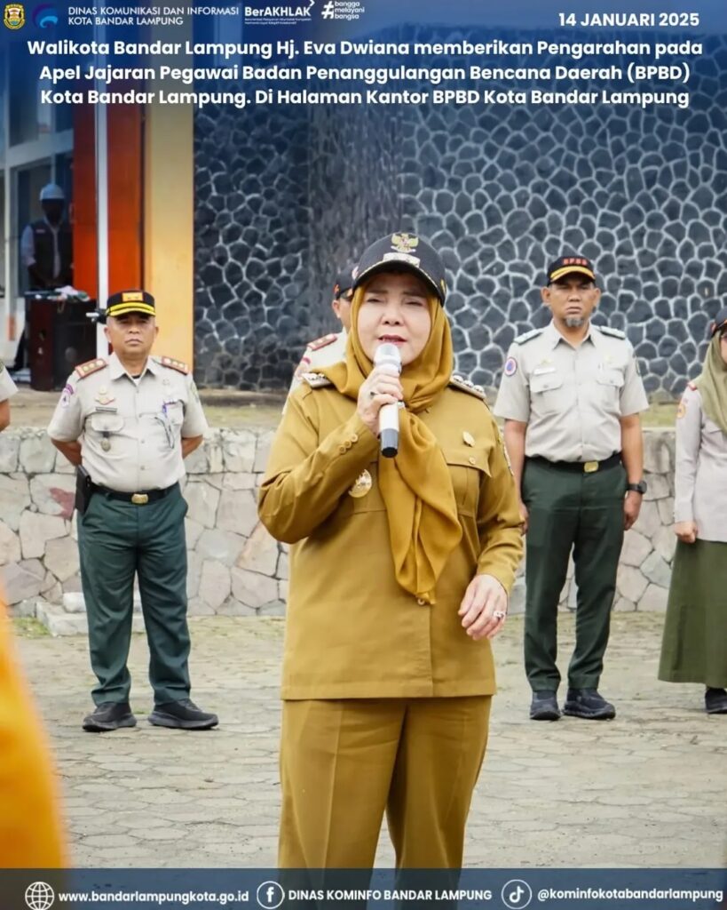 Walikota Bandar Lampung Hj. Eva Dwiana memberikan Pengarahan pada Apel Jajaran Pegawai Badan Penanggulangan Bencana Daerah (BPBD) Kota Bandar Lampung. Di Halaman Kantor BPBD Kota Bandar Lampung. Selasa (14/01/2025).