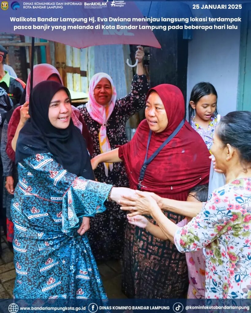 Walikota Bandar Lampung Hj. Eva Dwiana meninjau langsung lokasi terdampak pasca banjir yang melanda di Kota Bandar Lampung pada beberapa hari lalu.
